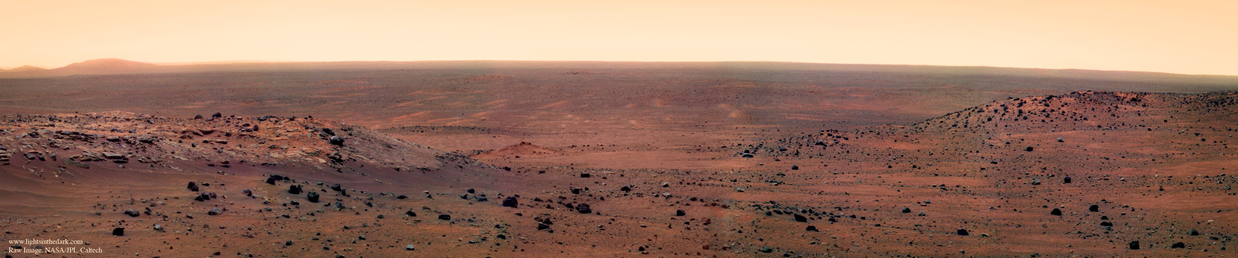 I combined five color images from the Spirit rover to make this panoramic view eastwards of its current position on the northwest edge of “Home Plate” (not visible here).
