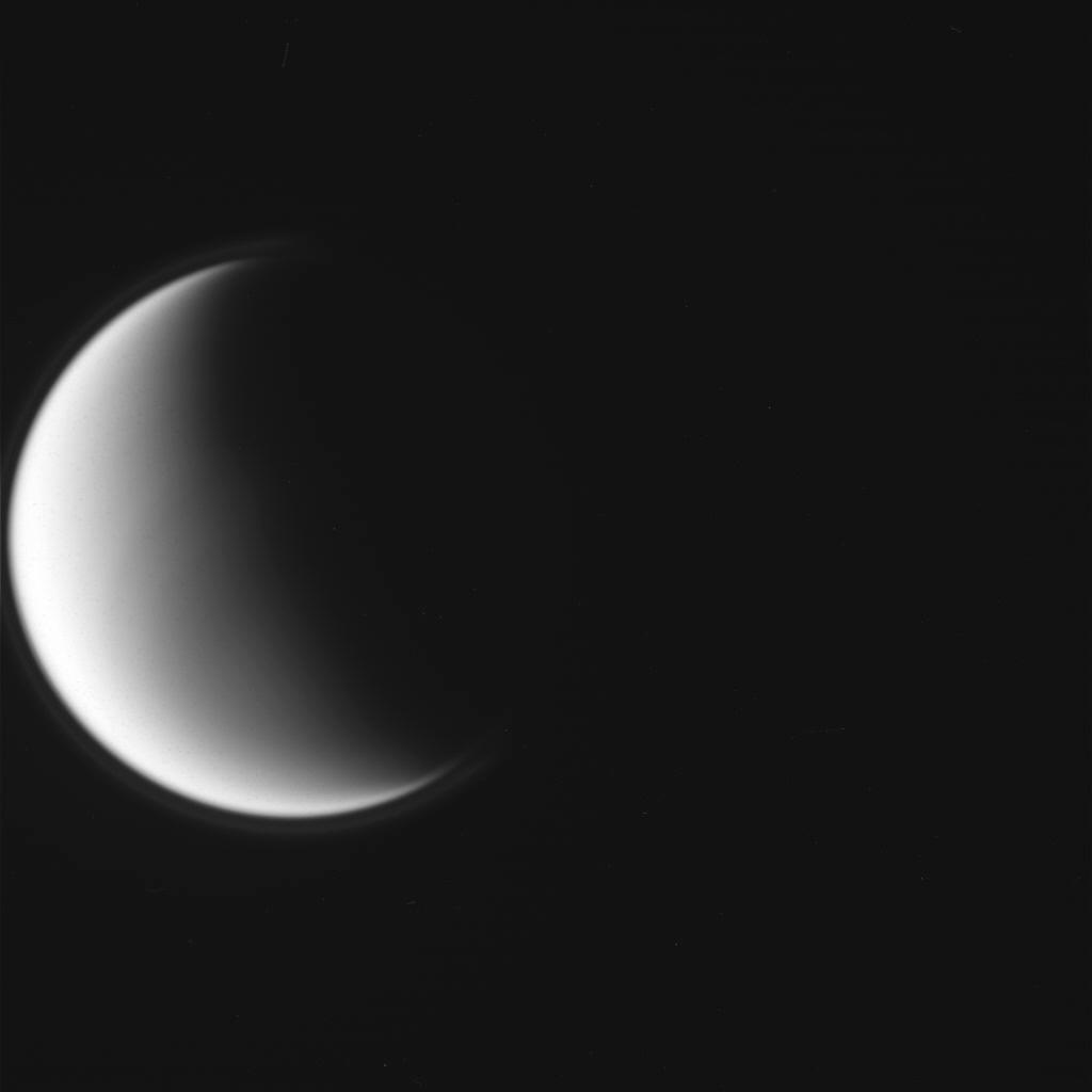 In addition to its enshrouding atmosphere, Saturn’s moon Titan also has a high layer of haze that encircles it. Made up of complex hydrocarbons from the breakdown of methane and nitrogen, this haze completely covers the moon and extends over 670 miles into space.