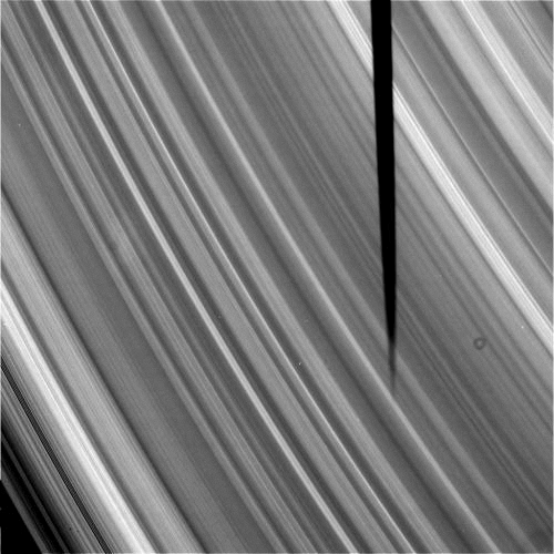 Beginning on the bright B ring the shadow moves across it, over the darker bands of the Cassini division, then crosses the even brighter A ring, including the channels of the Encke Gap and narrower Keeler Gap before disappearing off the edge before the thin F ring. Images like this are possible because of the current angle of Saturn relative to the sun…it is closely approaching its spring equinox when, on August 11, its ring plane will be perpendicular to its orbit. This causes several of its moons to cast shadows directly onto the rings. This is a real treat, since Saturn’s 29-year-long seasonal cycle doesn’t offer up views like this often (and it hasn’t had its own personal paparazzi in quite some time either!)