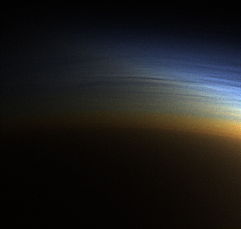 The image above is a true color calibration by Gordan Ugarkovic, showing an increased-contrast view of the atmosphere and haze above Titan’s north pole. This is more what the Enterprise would have been rising through, were the science 100% accurate (regardless that the rest of it isn’t). Both versions are amazing to look at.