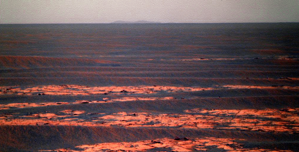 The Exploration Rover Opportunity, moving steadily across the low dunes of the Meridiani Plains while its sister Spirit is mired in soft sands half a planet away (temporarily we hope!), takes a photo of its eventual destination: the 14-mile-wide crater Endeavour, still several miles away.