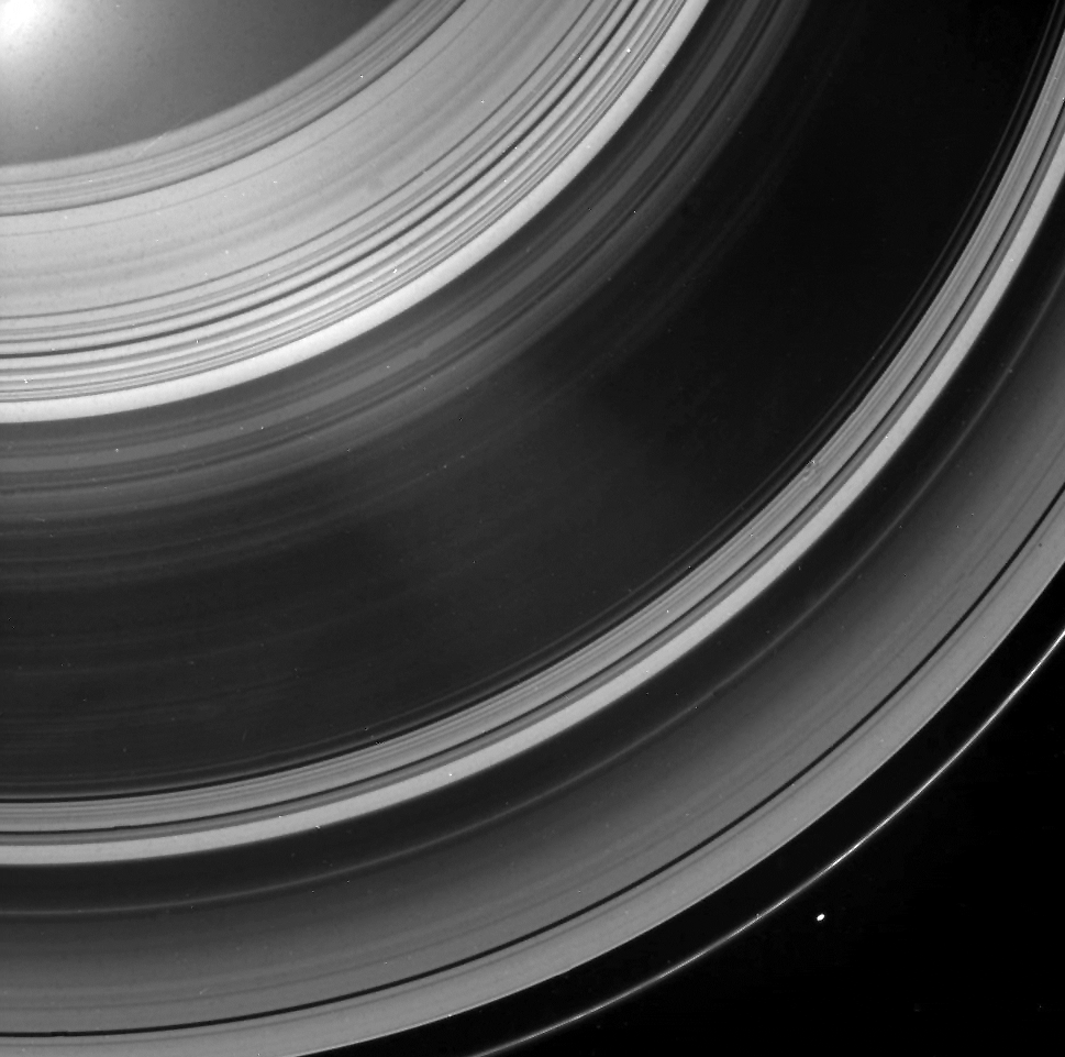 This animation, made up of 7 raw image frames taken by Cassini’s wide-angle camera, shows Saturn’s ring system ponderously rotating, the reflected light off the gas giant illuminating the dark material of the Cassini Division. In the lower right the moon Pandora orbits outside the twisted cords of the F ring. The planet itself is just out of frame to the upper left.