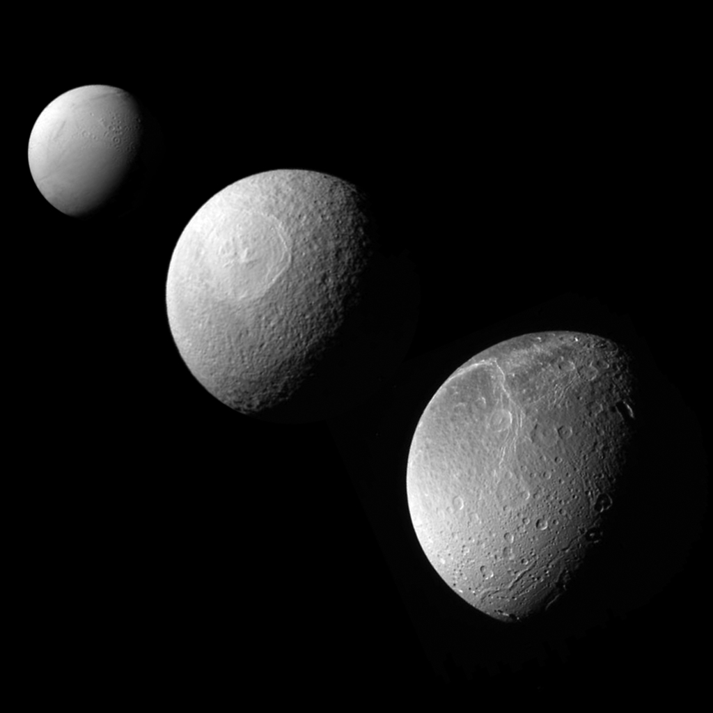 A little family portrait from the house of Saturn. Enceladus, Tethys and Dione.