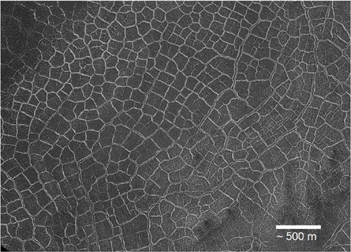 Similar to features found in dry lake beds on Earth, the cracks on Mars measure up to 30 feet wide and form polygonal shapes up to 460 feet across.