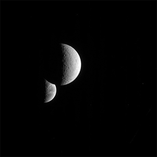 Rhea overlaps sister moon Dione in this image, taken by Cassini on October 22. One of a series of raw images showing the moons approach and then pass each other.