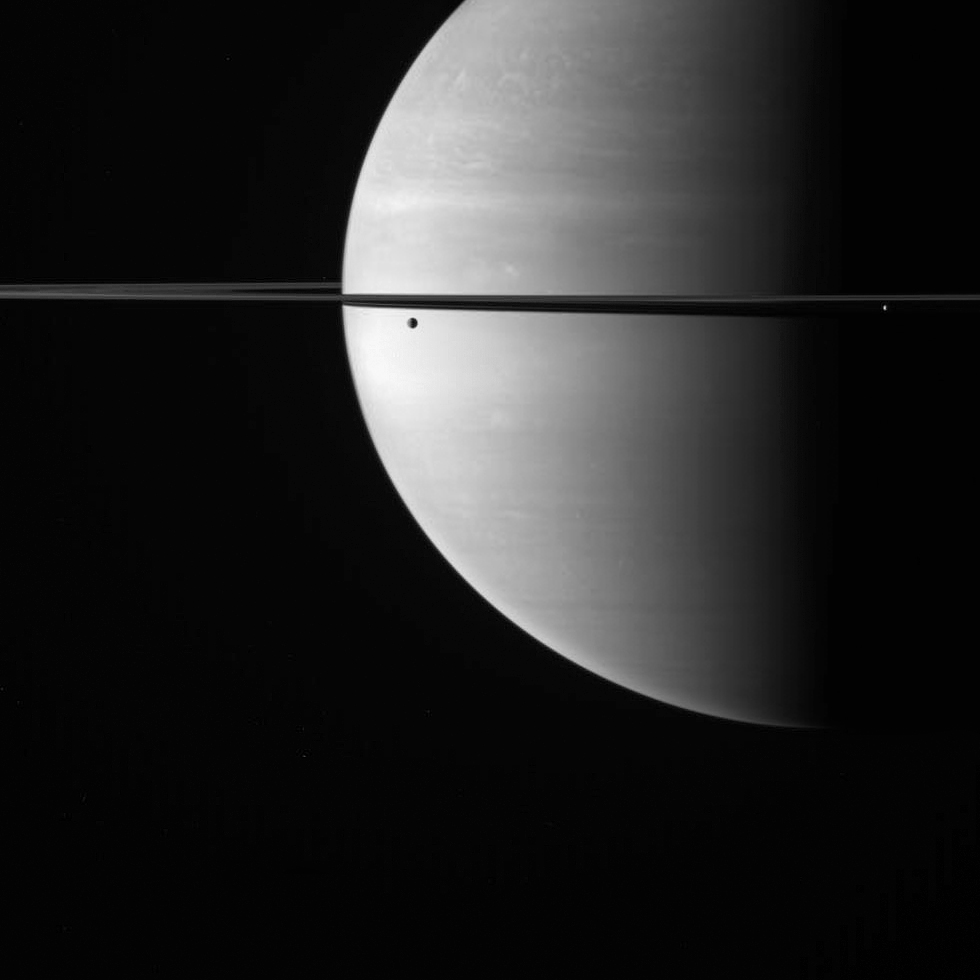 Moons Rhea and Enceladus orbit along the ringplane in this view from Cassini, taken November 6, 2009.