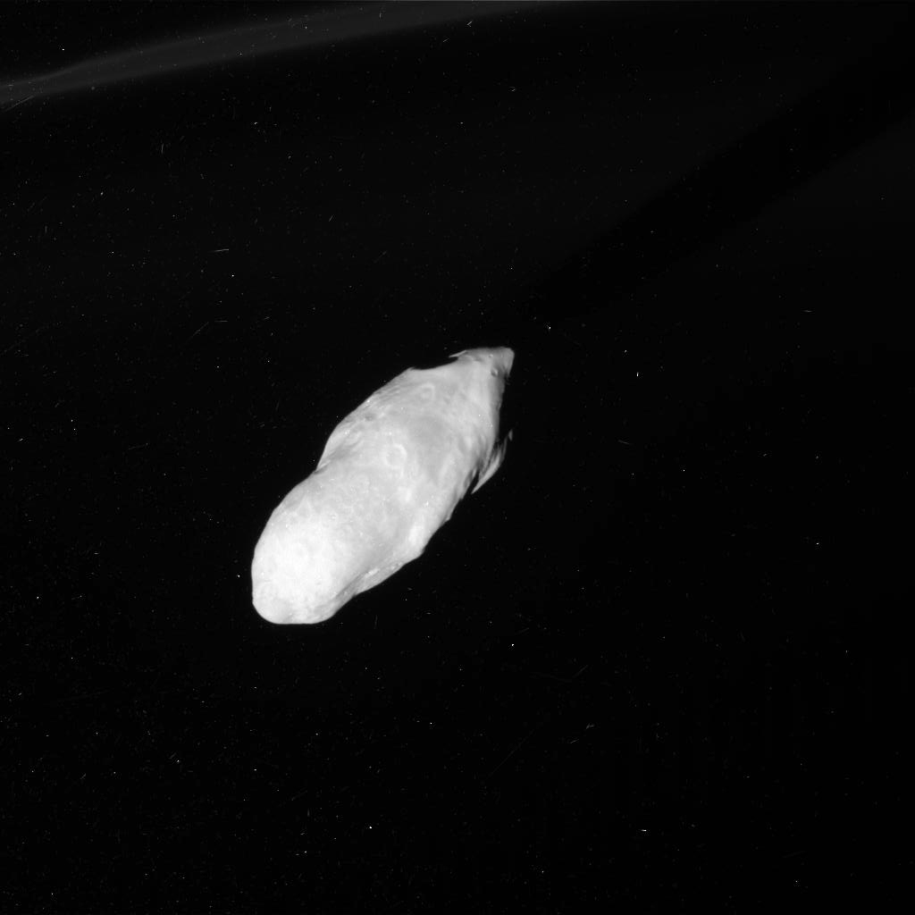 This is the closest yet that Cassini has come to the 96-mile-long oblong moon. Details of its cratered surface are visible, as is the shadow it casts into the material it pulls from the inner edge of the F ring (part of which can be seen at upper left.) This action is a defining characteristic of the little moon as its tumbling orbit causes it to dip in and out of the bright, icy ring, disturbing the material and pulling out long streamers with its passing.