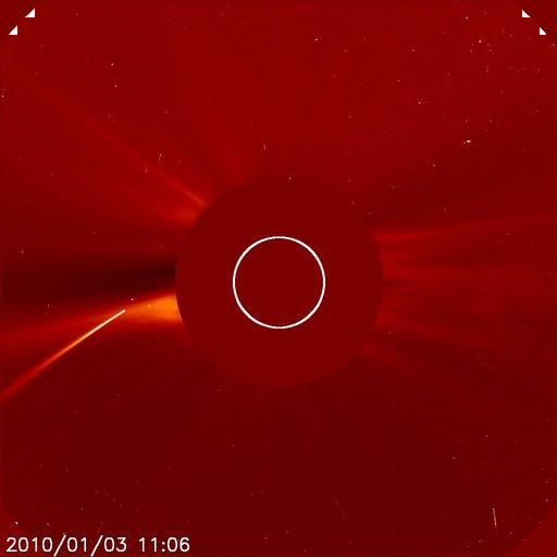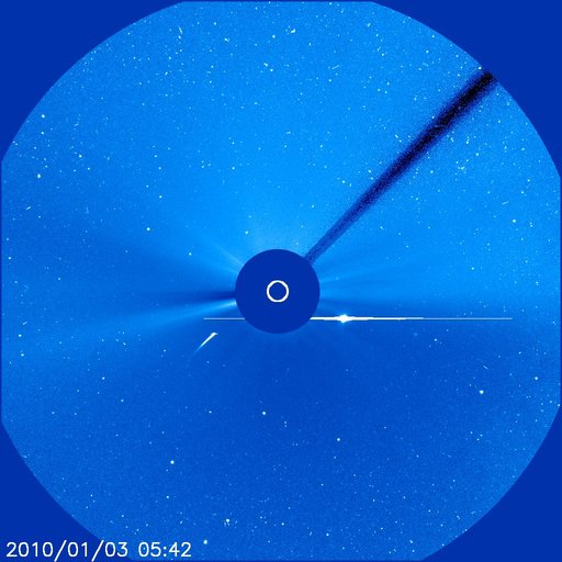 These two images, taken by the SOHO solar observatory spacecraft, show the last moments of a comet as it approaches the Sun in what turned out to be its final voyage…the Sun’s radiating energy sizzled the icy traveler shortly after. (See the video version on my earlier post.)