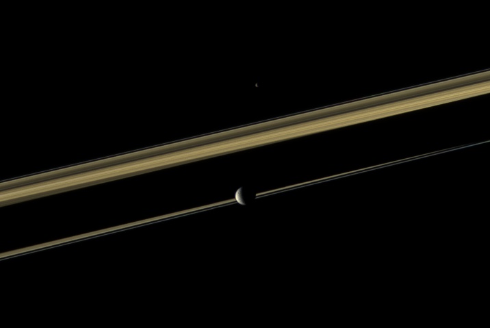 246-mile-wide Mimas (foreground) and 70-mile-wide Epimetheus bracket a section of Saturn’s rings in this color-calibrated image from the Cassini spacecraft, taken in October 2009.