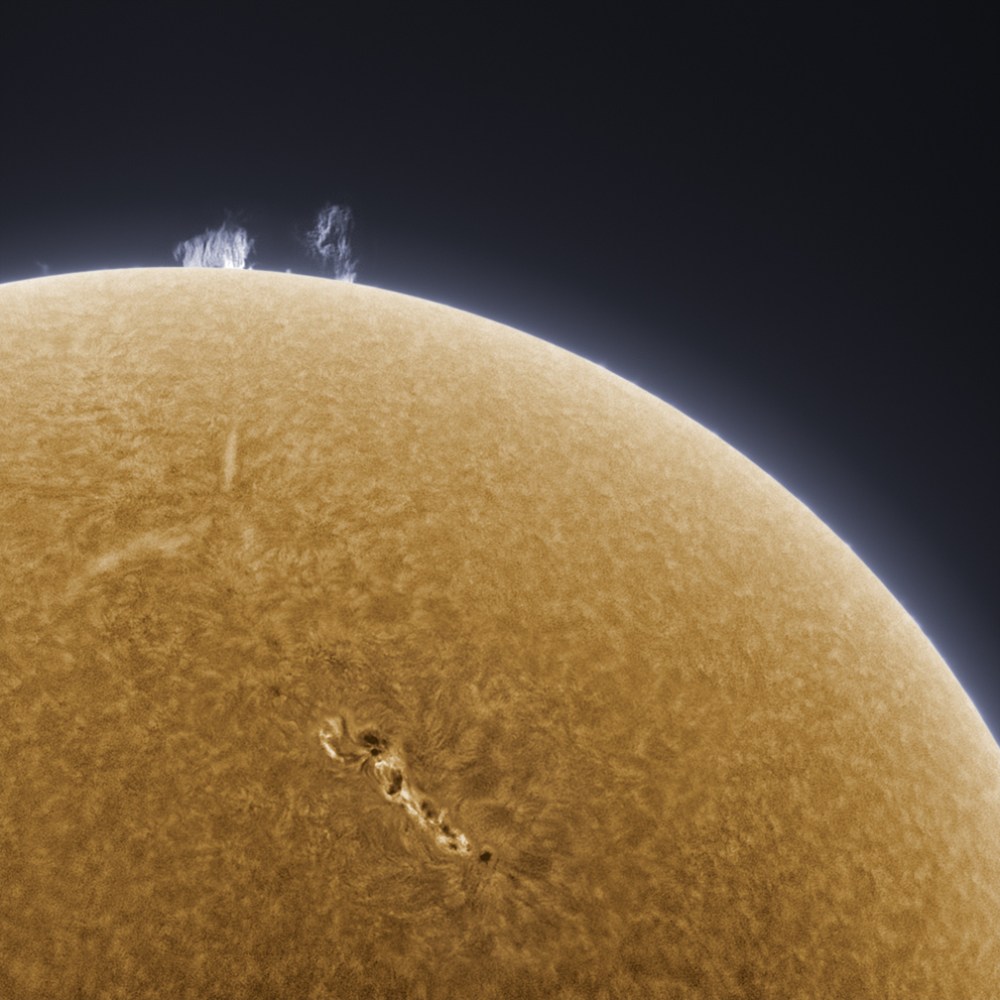 A gorgeous photo of our Sun by Alan Friedman, taken from his location in Buffalo, NY and uploaded to his site on February 7, shows a huge string of sunspots and an energetic region of prominences, as well as the granules and spicules that create the Sun’s surface texture. Sunspot 1045, the string seen here, is many tens of thousands of miles long and emits high-powered x-ray radiation and shortwave radio waves towards Earth. The radiation can actually be recorded as audio signals by radio astronomers…click here for some recordings from this large active region.