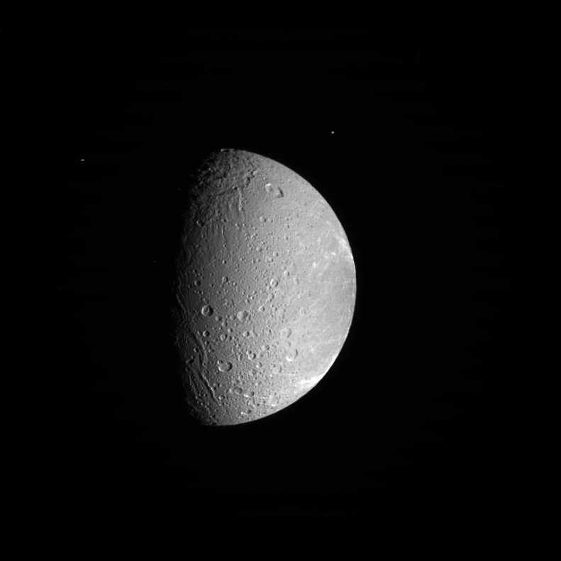 The heavily creased and cratered face of 700-mile-wide Dione is partially lit by the Sun in this image from Cassini, taken on March 4. Some of the moon’s characteristic “wispy lines” can be seen along its sunlit limb…these are the bright, exposed walls of icy canyons caused by ancient tectonic activity. The darker surface material that covers the rest of the moon can’t stick to these sheer cliffs, some many hundreds of feet high, and as a result they remain highly reflective to sunlight.