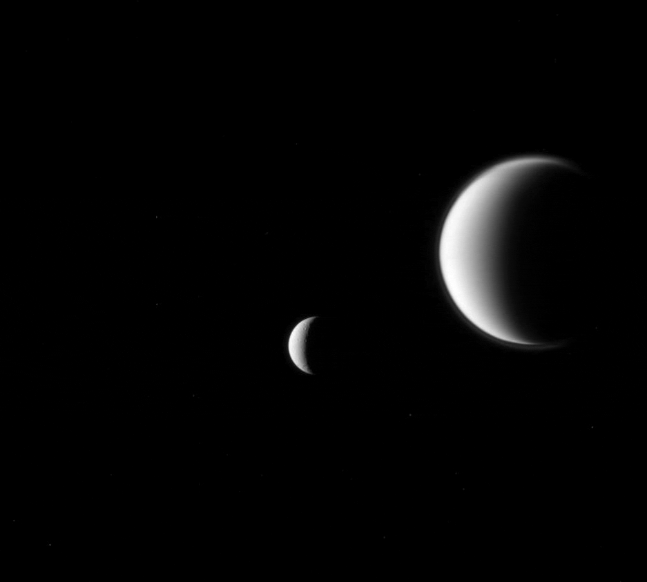 It’s been a while since I posted one of these…it’s an animation made up of 16 raw images from the Cassini spacecraft, taken on March 12, showing Saturn’s moons Dione and Titan passing each other. The small, cratered and frozen Dione couldn’t be more different than her much larger, haze-enshrouded sister Titan, but we’re reminded that they both share a place in orbit around Saturn…along with 51 other officially named moons, with more on the way.