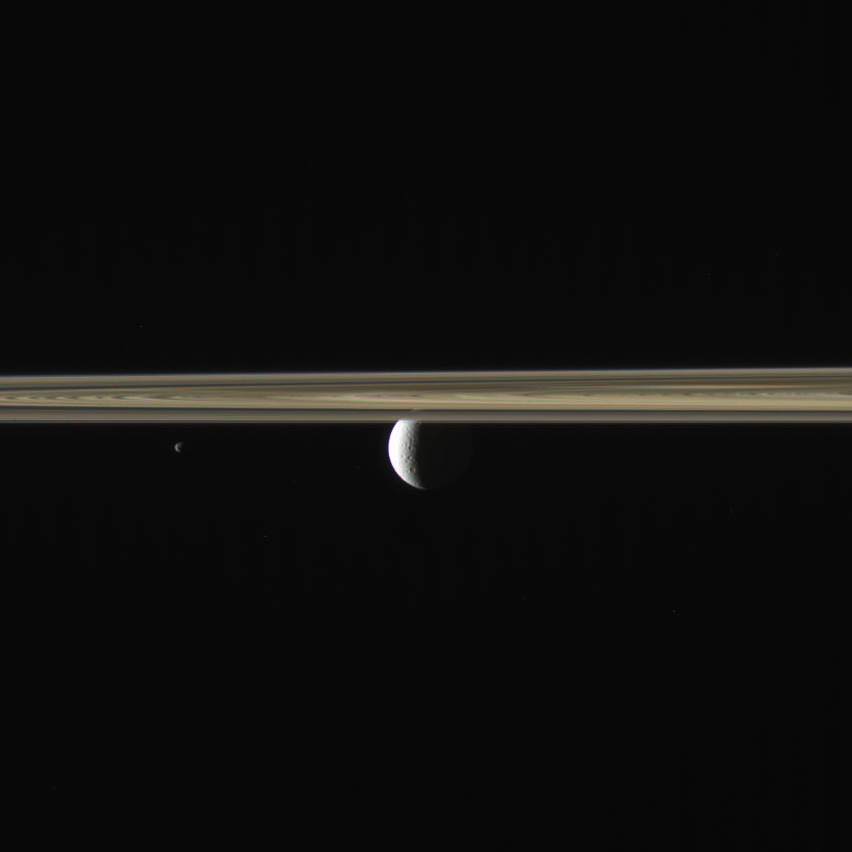 Here’s another color composite from Cassini, showing Rhea on the far side of the rings, its northern tip peeking through the Cassini Division. (I’m not 100% sure what smaller moon that is on the left, but my guess is either Janus or Epimetheus.)