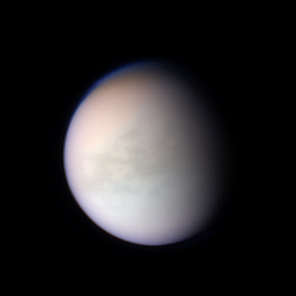Here’s an image of Titan as seen by Cassini on May 23, 2010. I combined data from the red, green and blue color filters as well as overlaying some surface detail of the moon’s dark dune fields captured with the spacecraft’s cloud-piercing near-infrared camera.