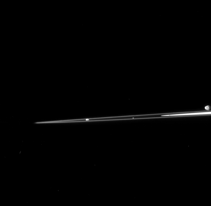 Four of Saturn’s 62 moons are seen passing each other in this animation, composed from 22 raw images taken by the Cassini spacecraft on July 27, 2010. Epimetheus, Prometheus, Janus and tiny Atlas all orbit Saturn within or near the ring system. As the animation begins, the potato-shaped Prometheus is just “rounding the bend” inside the edge of the thin F ring, making it appear to stand still for a moment before continuing on toward the right. Janus and Epimetheus appear to switch places as they pass each other, except that one is on the near side of the rings and the other on the far side. An interesting little vignette of the dynamics of Saturn’s family of moons!
