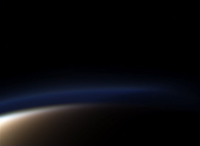 Composite RGB spectral data image from Cassini’s latest flyby of Titan, September 24, 2010. Not much image adjustment needed, this was basically “out of the box”! I love the coloration in the different atmospheric layers.