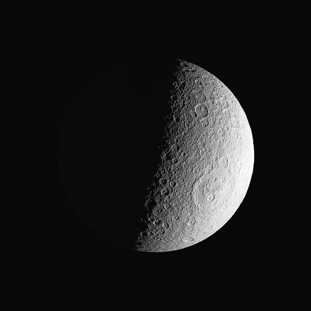 Here’s a wonderfully crisp portrait of Saturn’s moon Rhea, taken by Cassini on October 17, 2010 at an altitude of 24,300 miles. Illuminated on the right by sunlight, the left hemisphere is dimly lit by reflected light from Saturn.