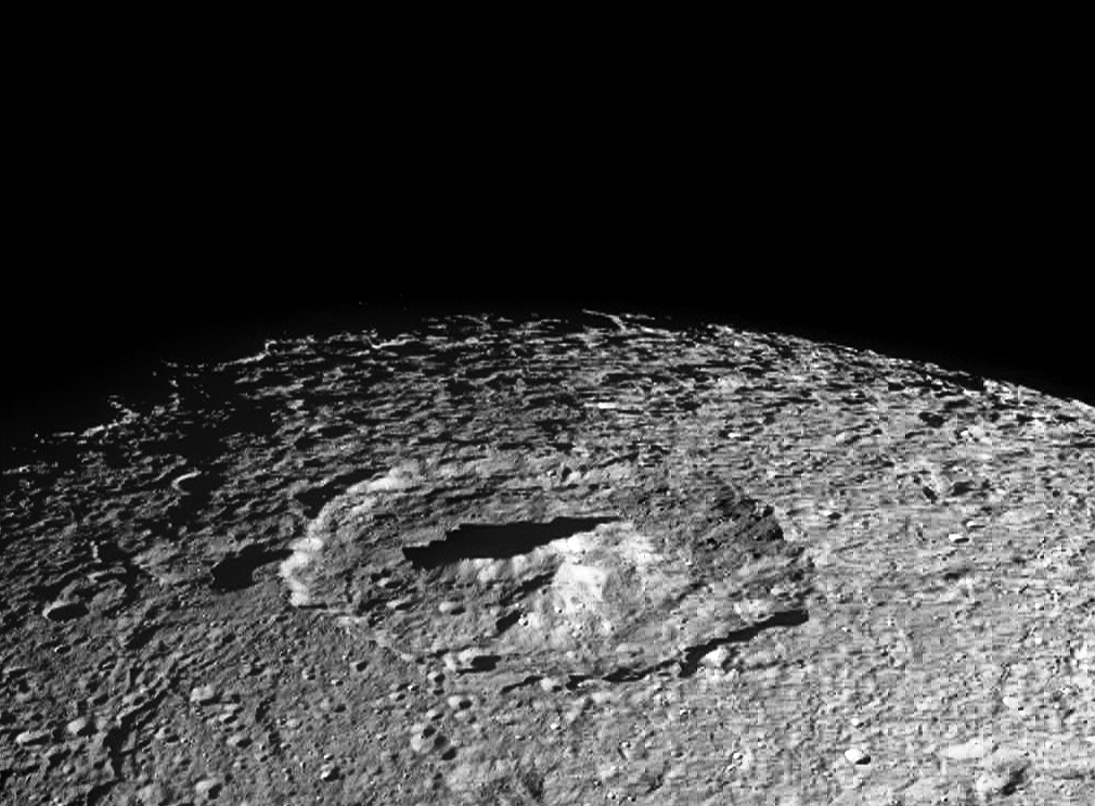 A crater’s central peak casts a long shadow in this image from Cassini, taken on October 17 as the spacecraft passed by Dione at a distance of 25,000 miles.