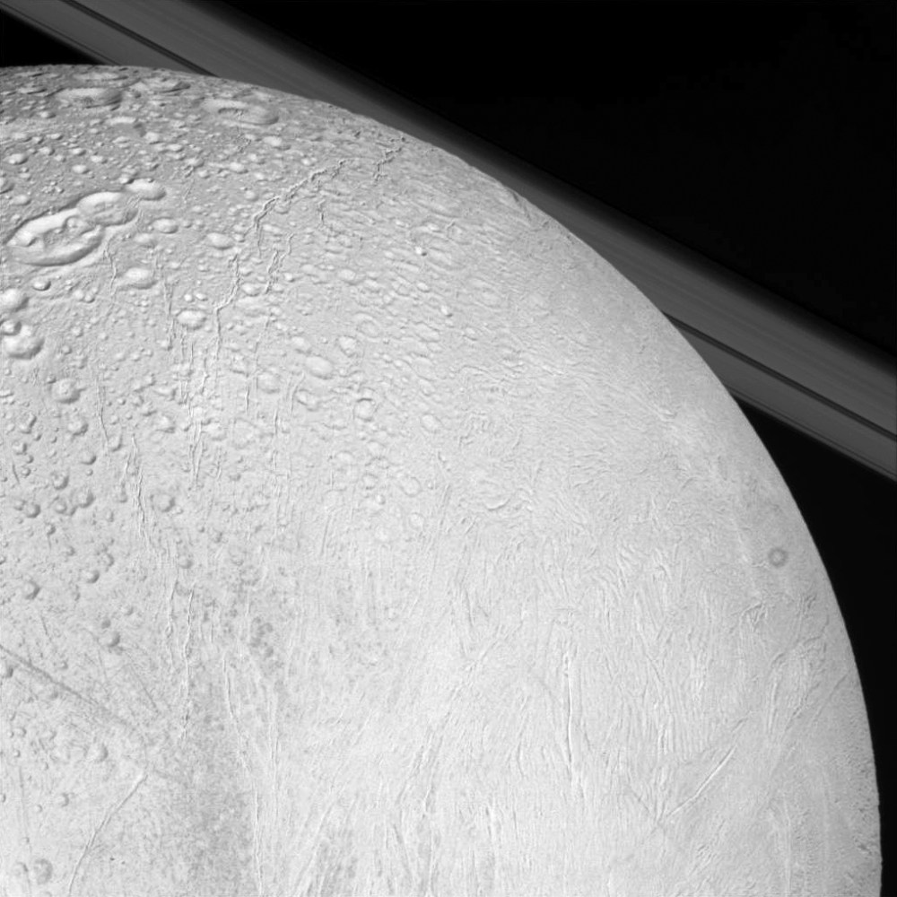 The spacecraft was about 28,500 miles (45,827 km) away from Enceladus when this image was taken. I adjusted the levels a bit to bring out some detail in the highly-reflective moon.
