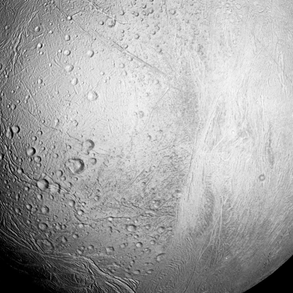 In fact, Enceladus features 5 different types of terrain, some clearly older than others (due to the presence of more craters), pointing at resurfacing processes having taken place within the (geologically) recent past – or even the existence of a liquid interior. And of course, we all know about the ice geysers! There’s definitely a lot going on on this little moon of Saturn…barely as wide as the state of Arizona, Enceladus is really a fascinating world full of surprises!
