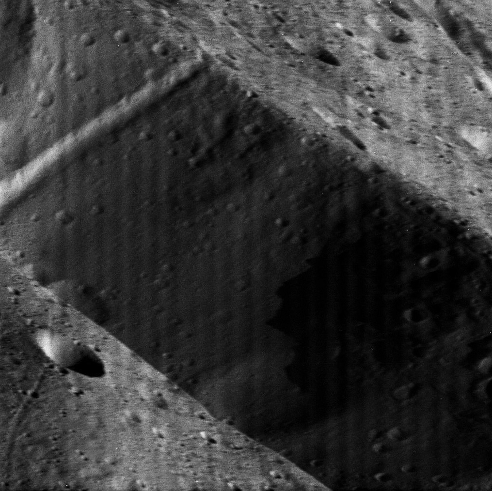 This next one took me a moment to figure it out…but once I turned it 180º I could see it was the rim of a crater or deep fault and Cassini was looking across it! The bottom left is the foreground rim, with a small crater of its own, then the sharp line of the edge and the far wall of the crater can be seen rising up toward the opposite rim at upper right. A long trough cuts into the far wall down into the floor of the crater. Very cool!