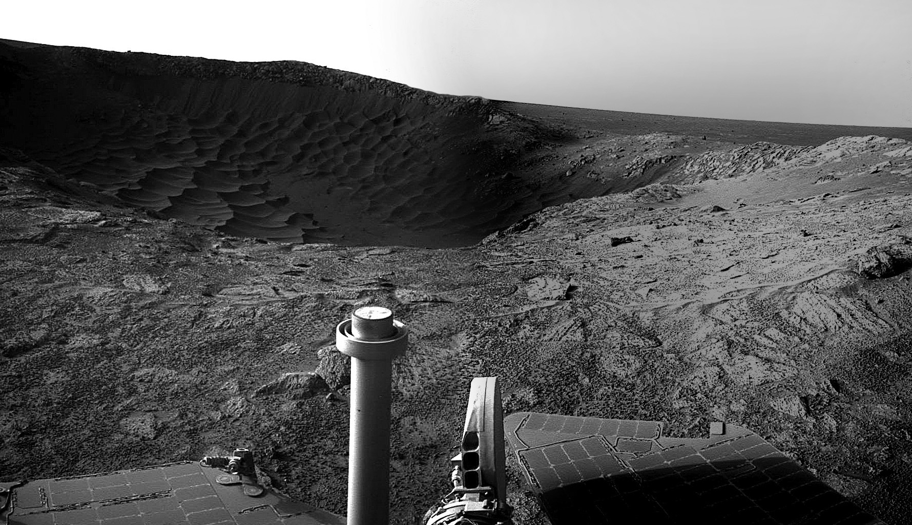 Here’s a great view of Santa Maria crater made from a couple of raw images from the Opportunity rover, taken earlier this month and assembled by Stu Atkinson. (I did take the liberty of cropping the original image a bit and filling in some of the sky at upper right.) I particularly like the texture of the wind-sculpted dunes in the crater’s floor…with the sun illuminating the scene at a low angle from the left, the relief is very nicely accentuated. The dark area in the center is a result of combining two images together to make a panorama.