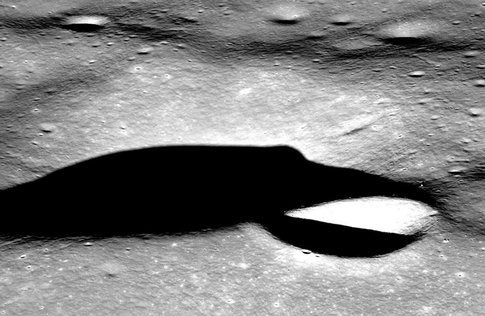 In another rare oblique-angle view from the Lunar Reconnaissance Orbiter we get a look at the hilly highland terrain around a lunar crater called Vertregt J. The image above shows a shadow being cast by a cratered ridge…check out the image at right for a larger zoomable view of the region. (This area is on the Moon’s far side so it’s not something that can ever be viewed directly from Earth.)