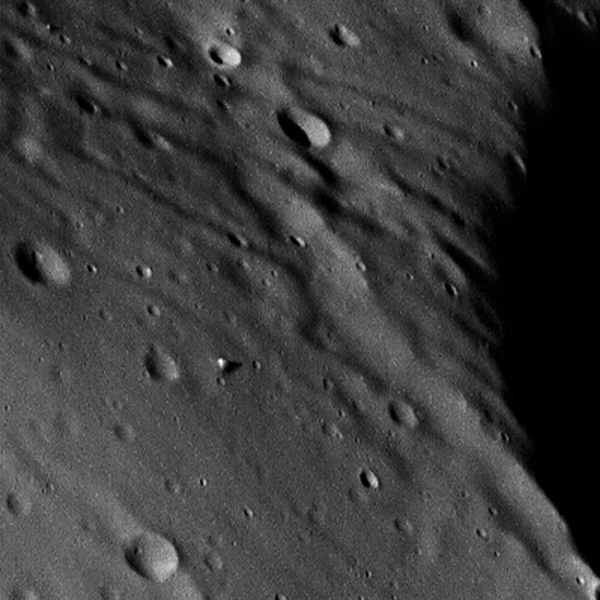 A high-res image of Mars’ moon Phobos, acquired on January 9 by ESA’s Mars Express, shows a large boulder on the irregularly-shaped moon’s southern hemisphere. It rests near the edge of a large crater…when I rotated the image it looked as if it should just start rolling backwards and slide right over the edge! (The crop above was rotated 90º counter-clockwise.) This is the largest boulder visible on the southern end of Phobos in the High Resolution Stereo Camera (HRSC) images. Craters and grooves cover the rest of the 13-mile-wide moon.