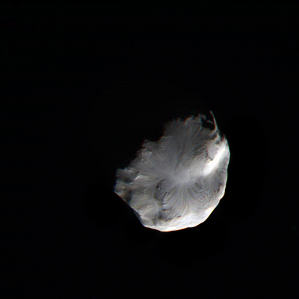 The image here shows some really interesting texture on Helene…grooves running outwards from a central point on the little moon. I’m not sure what side of Helene we are looking at here, but it would make sense if this were its leading face that we are seeing the result of motion into its orbit, perhaps the result of meteorite weathering or some other debris falling onto it along its path, maybe material ejected from Dione?