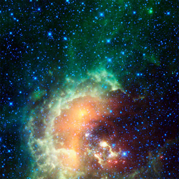 Above is an infrared WISE image of the Tadpole nebula, a star-forming region in our galaxy 12,000 light-years away. Using multiple frames to make this image, WISE spotted two asteroids crossing its field of view, one near the center of the nebula and the other in the upper left. They each appear as a line of bright dots in the final image. (Actually the center asteroid had already been discovered in 1950, it is a 12-mile-wide main belt asteroid named 1719 Jens.)