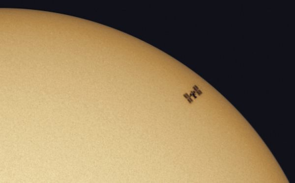 Astronomy hobbyist and solar photographer extraordinaire Alan Friedman captured a wonderful image of the International Space Station transiting the edge of the Sun’s disc during a Winter Star Party in Florida on March 1, 2011. Taken with a solar telescope that images the Sun in hydrogen alpha light, the image above clearly shows the ISS with solar panels outstretched – as well as the space shuttle Discovery docked in its lower center! Fantastic!