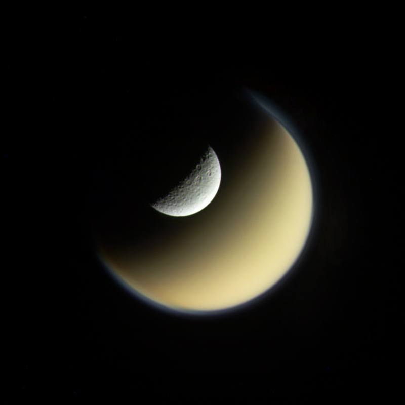 Titan’s atmosphere and high-level haze can be seen in this image, and you can also see where the moon’s shadow cuts through the haze at the south pole (up and to the right in this image.)