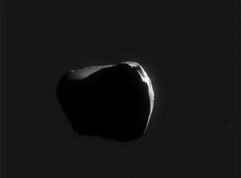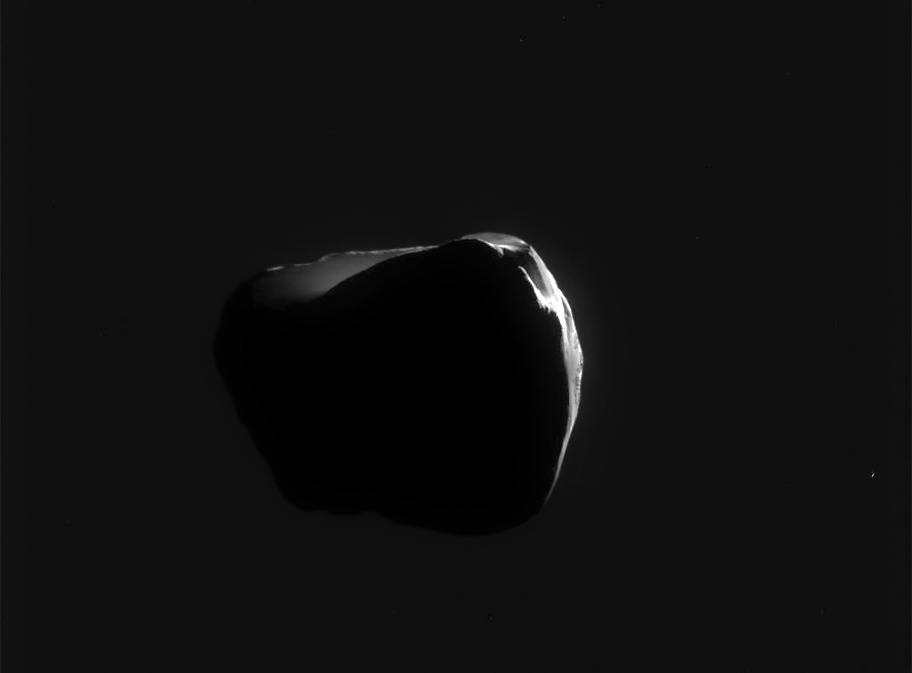 Here’s another intriguing look at Helene, lit by sunlight from the right while some reflected light from its own highlands illuminates the interior of a valley/crater. Its dark side appears pitch black against the slightly brighter region of space behind, possibly lightened by the diffuse reflected light from ice particles in Saturn orbit.