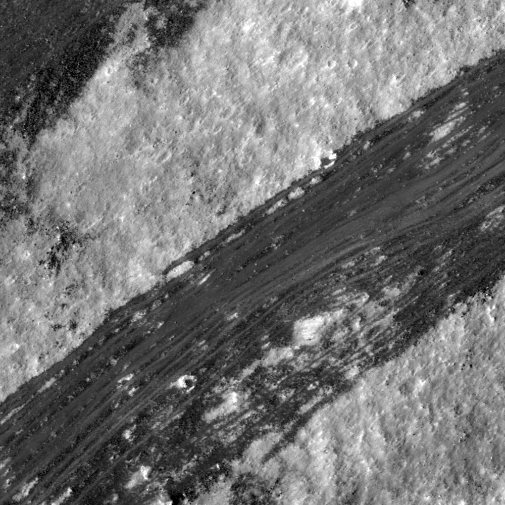 This is a small portion of a Narrow-Angle Camera image taken by the Lunar Reconnaissance Orbiter, showing detail of “low-reflectance” granular material sliding down the wall of a crater located on the far side of the Moon. It’s assumed that these streaks are a result of a dry process rather than molten because there’s no visible melt near the crater’s rim (towards the upper right) but there is melt on the floor of the crater. (“Melt” is the term for solidified lunar lava created as the result of a meteorite hit.) Granular dry flows can mimic the appearance of “wet” flows very closely, so often with images like this researchers must look around the surrounding area for more clues to the likely creation of features.