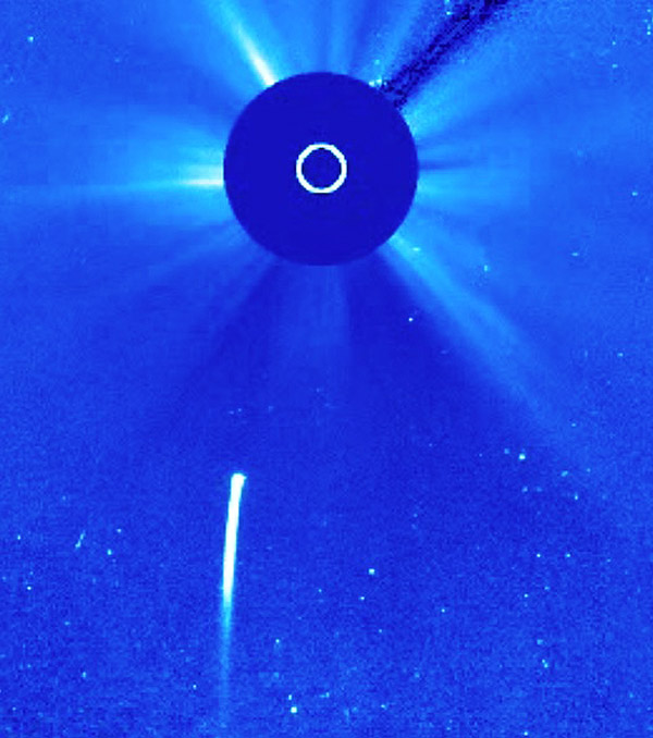Lovejoy (designated C/2011 W3) first came within view of ESA’s SOHO orbiting solar observatory on Dec. 12. Since then its final journey has been observed as it gets ever closer to the Sun. The image above is a still from the latest video update, which can be seen here. (The Sun is located behind the blue disc, its actual size is denoted by the white circle.)
