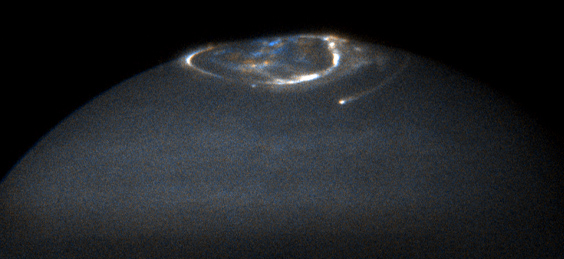 Acquired in March 2007, this eerie image from Hubble’s Advanced Camera for Surveys’s ultraviolet camera show glowing auroral emissions, always present in Jupiter’s polar regions.