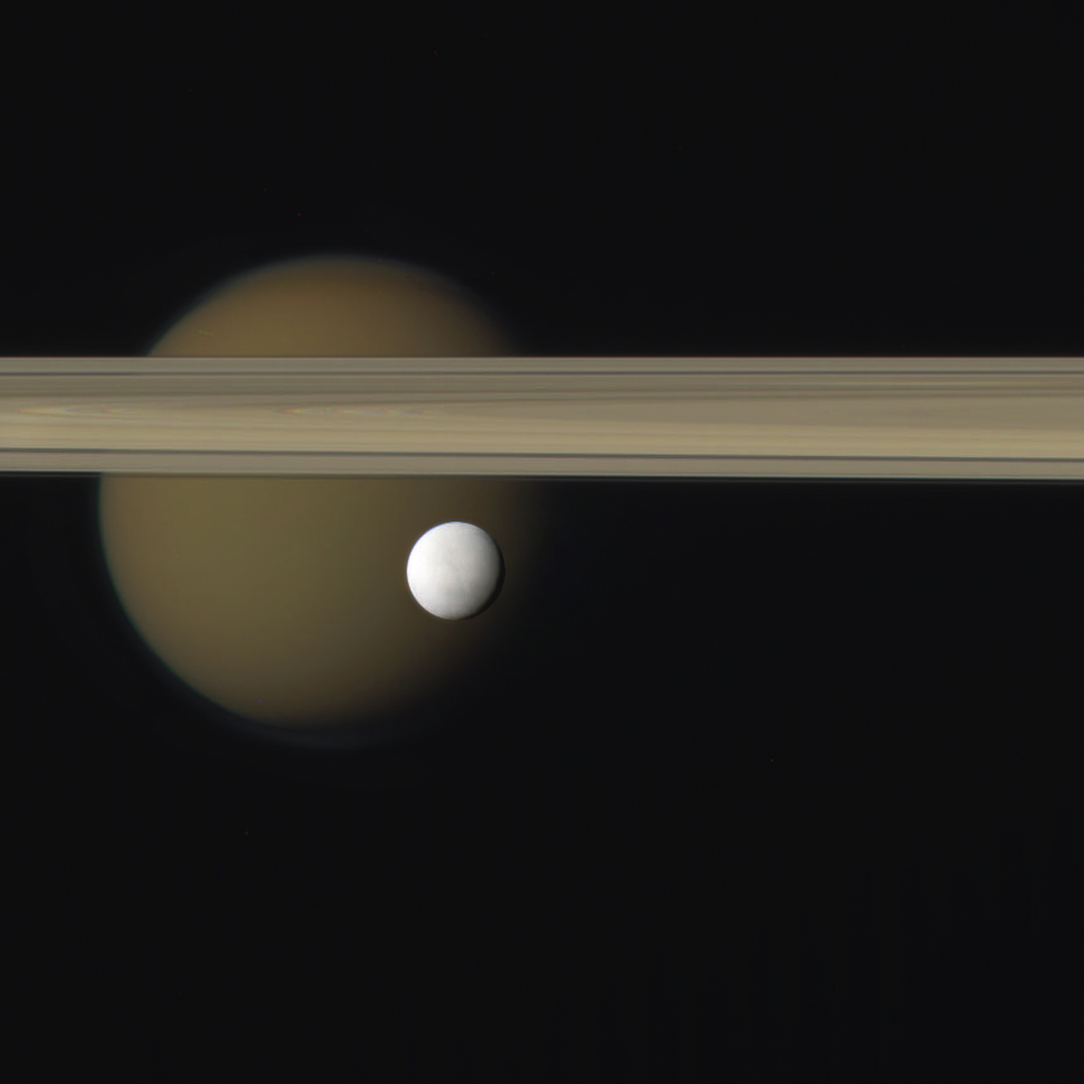 Saturn, Saturn's Moons Pretty as a Picture: Enceladus and Titan Posted by Jason Major on March 20, 2012 Color composite of Enceladus, Titan and Saturn's rings. Little Enceladus and enormous Titan are seen on either side of Saturn’s rings in this image, a color-composite I made from raw images acquired by Cassini on March 12, 2012. Read more here. Rate this:Like this article? Share it! Click to share on X (Opens in new window) X Click to share on Facebook (Opens in new window) Facebook Click to share on Pinterest (Opens in new window) Pinterest More Click to email a link to a friend (Opens in new window) Email Click to share on Reddit (Opens in new window) Reddit Click to share on Tumblr (Opens in new window) Tumblr Click to share on LinkedIn (Opens in new window) LinkedIn Like Loading... Related