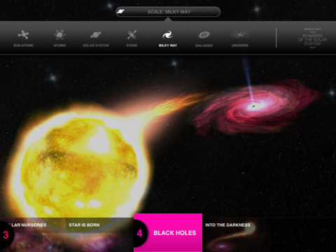 • Seven apps in one, all of which are linked 3D environments to explore: Subatomic, Atomic, Local Stars, Solar System, Milky Way, Galaxy and the Universe