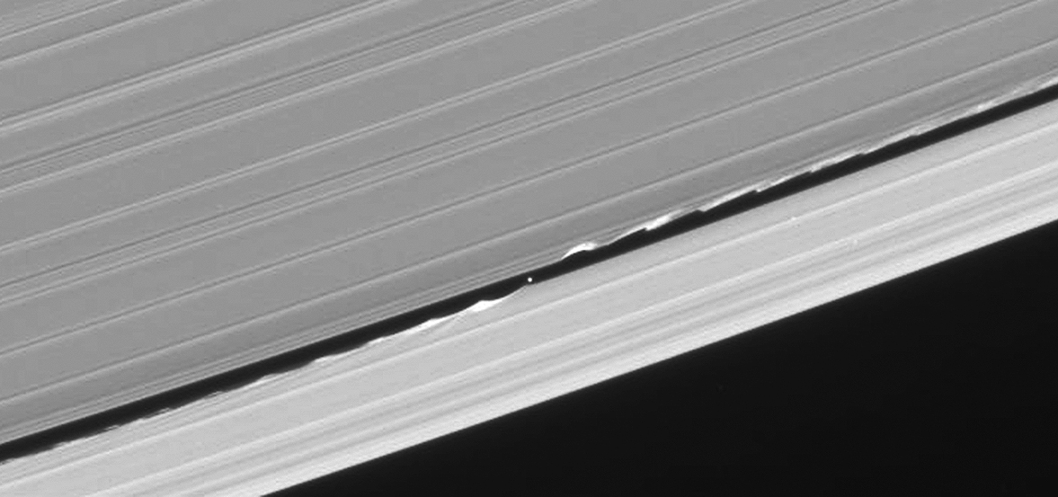 Like Prometheus, shepherd moon of the ropy F ring, Daphnis is little but has a big effect on the icy bits that comprise Saturn’s iconic rings.