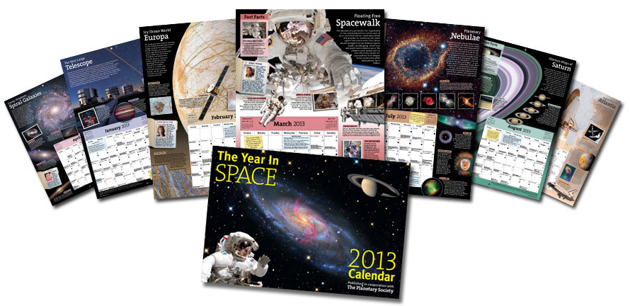 Right now, the Year in Space 2013 calendars are available for order online here for the crazy low price of $12.95 each or $11.95 for 2 or more (with additional discounts at higher quantities) as well as free shipping throughout the U.S… and you’ll also get 50% off a new membership to The Planetary Society if you order online.