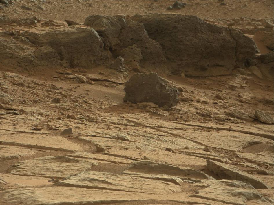 The science team has chosen three targets for brief observations before Curiosity leaves the Glenelg area: the boundary between bedrock areas of mudstone and sandstone, a layered outcrop called “Shaler” and a pitted outcrop called “Point Lake.”