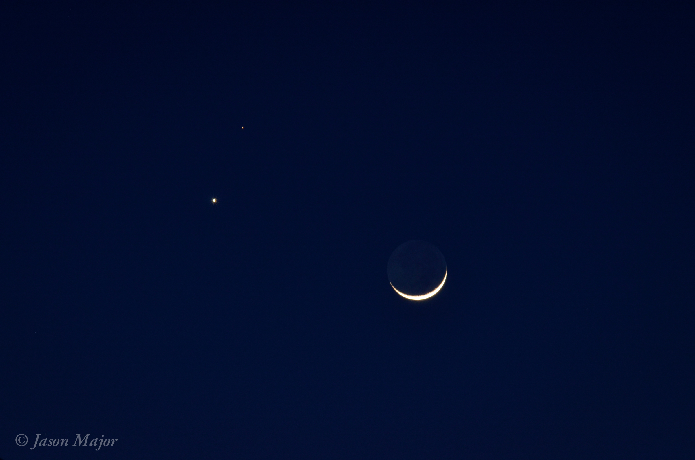 I captured the photo above with a Nikon D7000 and a Sigma 150-500mm lens. Venus is the brighter object at left, Mars appears dimmer and redder above. Part of the Moon’s “dark side” can be seen due to Earthshine – sunlight reflected off Earth onto the Moon. (Sometimes romantically called “the old Moon in the new Moon’s arms.”)