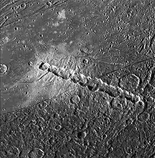 Captured by NASA’s Galileo spacecraft on April 5, 1997, this image shows Enki Catena, a 161.3-km (100-mile) long crater chain on the surface of Jupiter’s moon Ganymede. Named after the Sumerian god of fresh water, Enki Catena is thought to have been formed when a comet approached too close to Jupiter and was torn into 13 pieces, each impacting Ganymede in rapid succession… sort of a miniature version of what occurred in 1994 with comet Shoemaker-Levy 9.