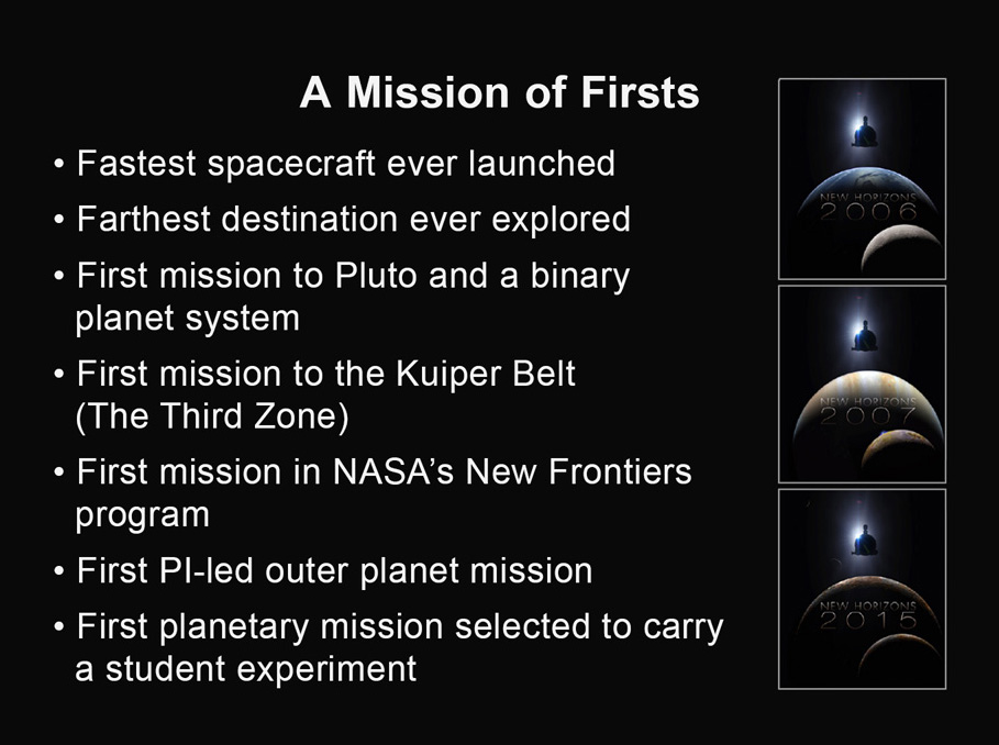 “This is pure exploration; we’re going to turn points of light into a planet and a system of moons before your eyes!” said Alan Stern, New Horizons principal investigator from Southwest Research Institute (SwRI) in Boulder, Colorado. “New Horizons is flying to Pluto — the biggest, brightest and most complex of the dwarf planets in the Kuiper Belt. This 21st century encounter is going to be an exploration bonanza unparalleled in anticipation since the storied missions of Voyager in the 1980s.”