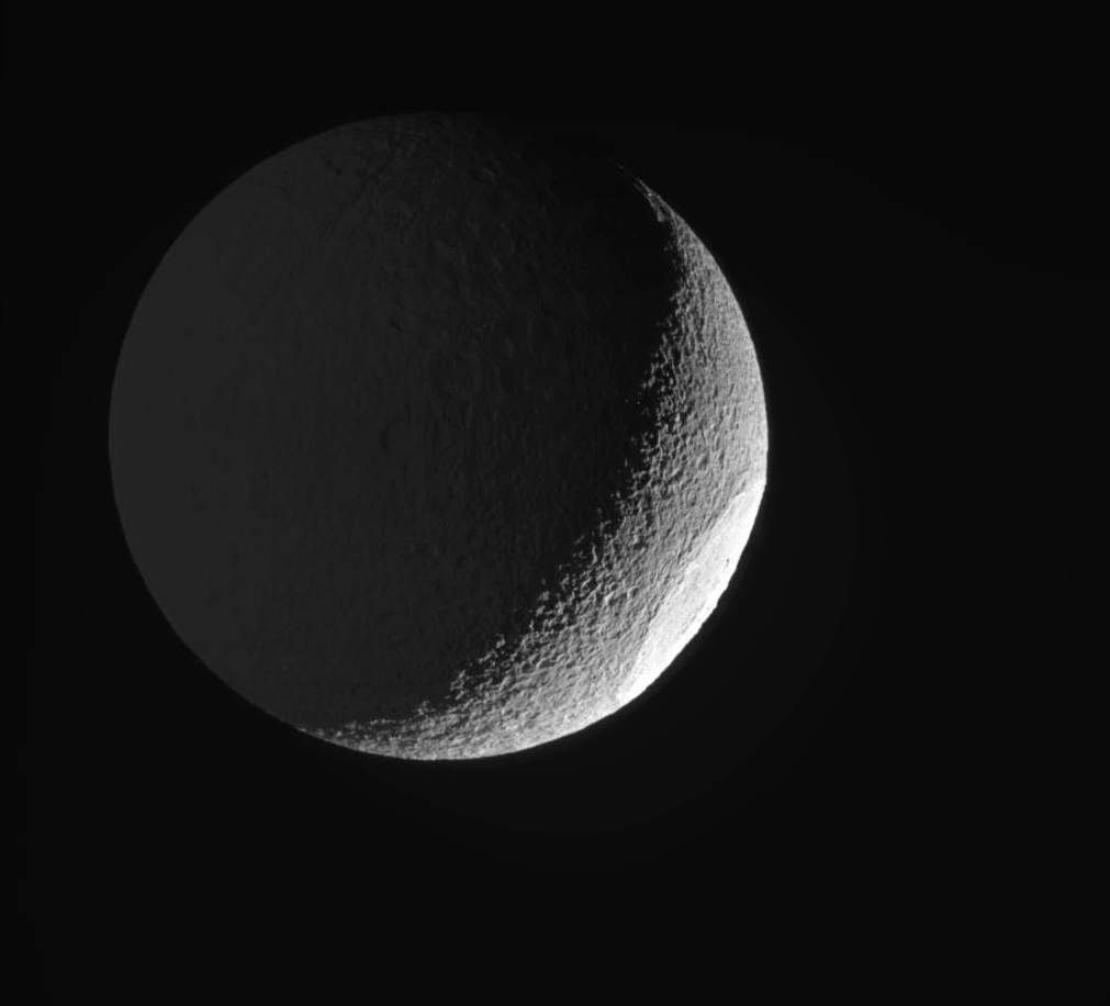 Here’s a beautiful view of Saturn’s moon Tethys (pronounced TEE-this) captured by the Cassini spacecraft’s narrow-angle camera on May 9, 2015. The moon’s 250-mile Odysseus crater can be seen along the right limb there, illuminated by sunlight, while the left side is lit by the dimmer reflected light from Saturn.