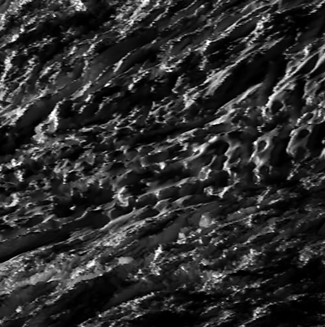 The clearest view thus far of Enceladus’ surface from E-21, captured during closest approach. (Raw image has been upscaled and rotated.)