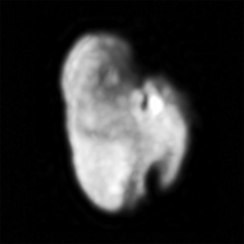Only a small point of light in even the best Hubble images prior to July 2015, Hydra was seen by New Horizons to be an irregular moon shaped “like the state of Michigan” with at least two relatively large craters and an upper region slightly darker than the lower. Read more here.