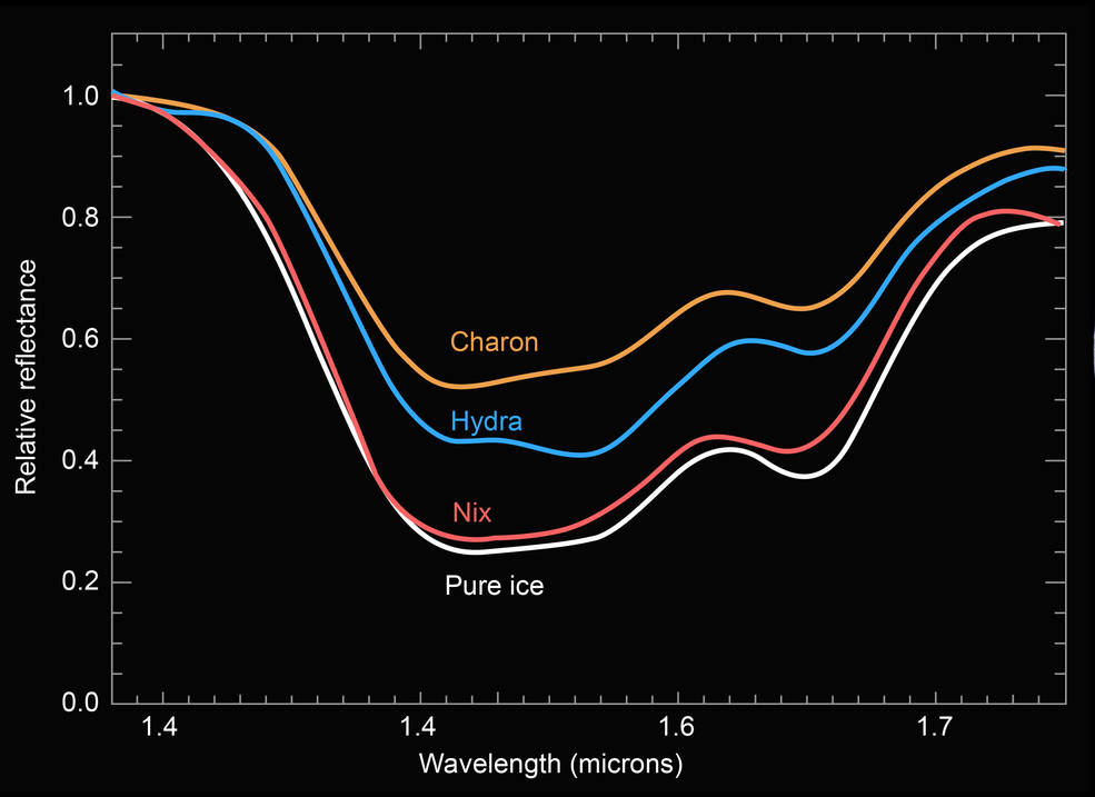 The deeper spectral features on Nix seen in the graph above are a signature of water ice that is relatively coarse-grained and pure, because the shape and depth of water-ice absorption depends on the size and purity of the icy grains on the surface. Scattering from smaller, or less pure, icy grains tends to wash out spectral absorption features, making them shallower. (Source)