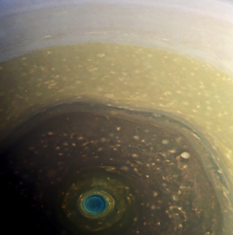 This isn’t the best view of Saturn’s vortex that Cassini has captured (that would be this) but it certainly highlights the striking color variations of the feature, which give us a look deep into Saturn’s violent atmosphere.
