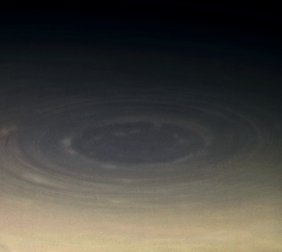 I’ve often posted about the vortex at the north pole of Saturn—and yes it’s quite impressive—but there’s also a similar feature at Saturn’s south pole as well, albeit a bit more subtle and much less turbulent. The image above is a color view, made from raw data acquired in red, green, blue, and polarized light by NASA’s Cassini spacecraft on July 15, 2008. That was a just over a year before Saturn’s spring equinox and the planet’s south pole was moving into shadow, but still had enough illumination for Cassini to capture some images.